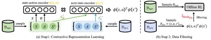 Image credit: Chenjia BaiCross-domain offline reinforcement learning leverages source domain data with diverse transition dynamics to alleviate the data requirement for the target domain. However, simply merging the data of two domains leads to performance degradation due to the dynamics mismatch. Existing methods address this problem by measuring the dynamics gap via domain classifiers while relying on the assumptions of the transferability of paired domains. In this paper, we propose a novel representation-based approach to measure the domain gap, where the representation is learned through a contrastive objective by sampling transitions from different domains. We show that such an objective recovers the mutual-information gap of transition functions in two domains without suffering from the unbounded issue of the dynamics gap in handling significantly different domains. Based on the representations, we introduce a data filtering algorithm that selectively shares transitions from the source domain according to the contrastive score functions. Empirical results on various tasks demonstrate that our method achieves superior performance, using only 10% of the target data to achieve 89.2% of the performance on 100% target dataset with state-of-the-art methods.